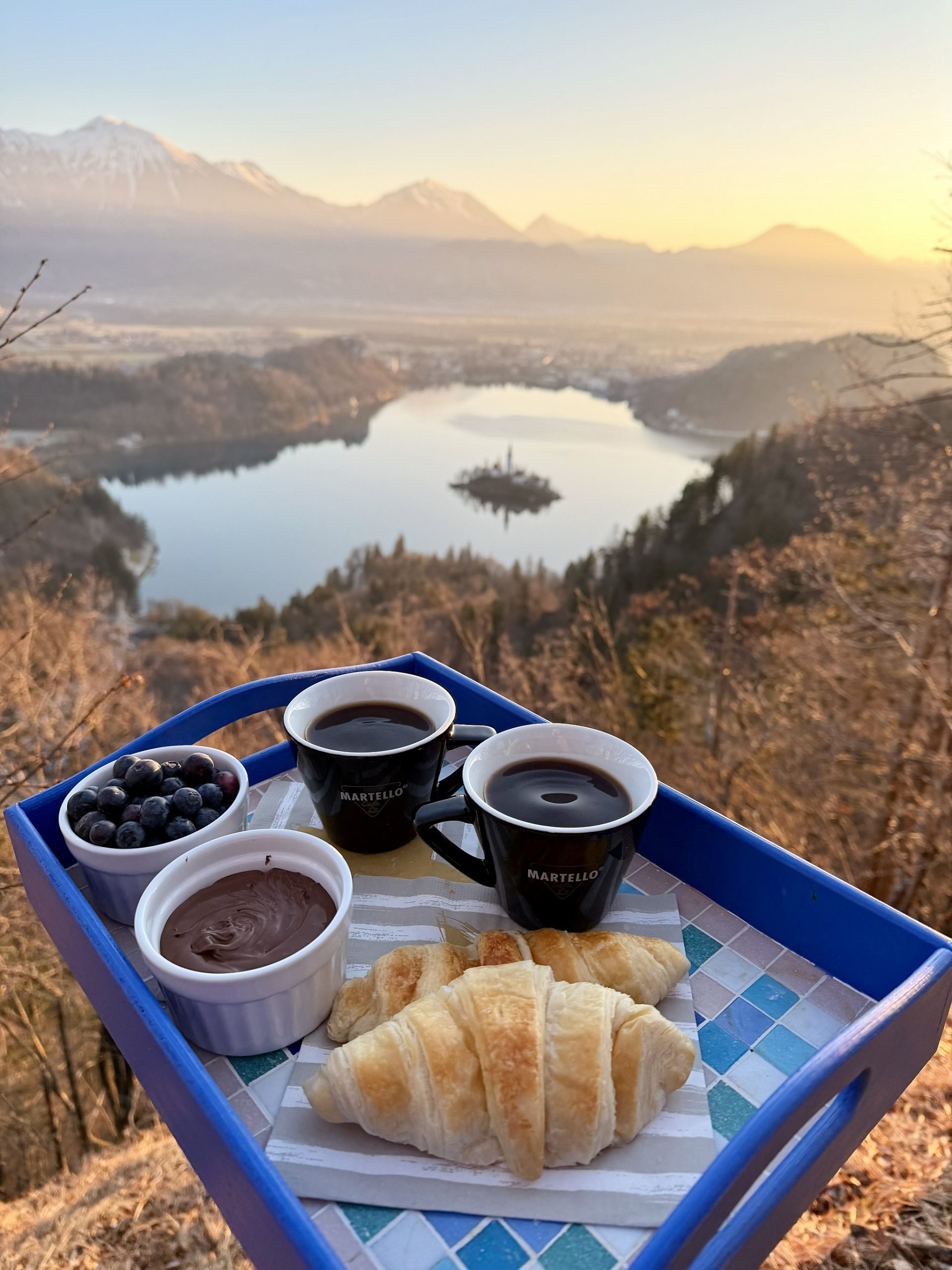 Na vrhu nas pričaka eden najlepših razgledov na Blejsko jezero, otoček, grad ter okoliške gore. To je popoln kraj za romantični zajtrk, zato predlagam, da s seboj vzamete termovko s čajem ali kavo ter kakšno dobro malenkost. Ob poti in na vrhu je tudi več klopi za prijeten postanek.